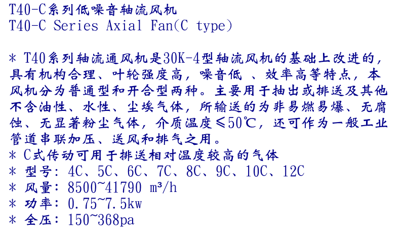 T40-C式系列皮帶傳動軸流式通風機,主要用于抽出或排送及其他不含油性、水性、塵埃氣體,所輸送的為非易燃易爆、無腐蝕、無顯著粉塵氣體,介質溫度≤50℃,還可作為一般工業管道串聯加